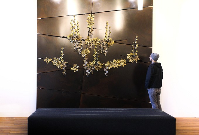 这件作品由西雅图一家公司委托制作,呈现了小花从裂缝中生长的场景。Casey Curran 共制作了84朵小花,且每朵小花都能够开合。