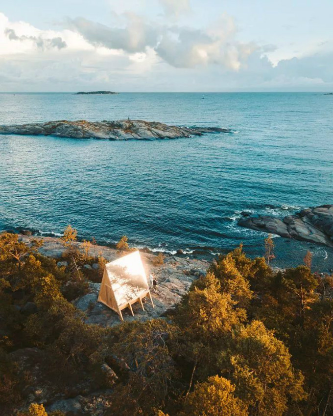 在Vallisaari岛上,有这样一座模块化的建筑,外观呈三角形,内部只有9平方米大小。从芬兰赫尔辛基乘坐轮渡,只需要9分钟就能到达这座小岛。