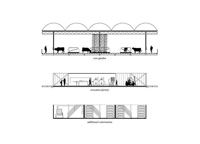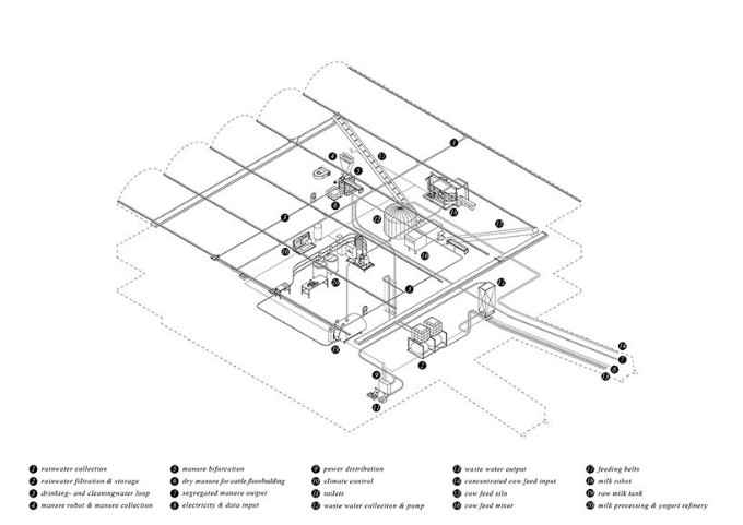 三座相连的混凝土浮桥分别存放水果(酸奶原料)的生产、雨水、废水回收和额外的装置,而上厂地板则包含牛奶和酸奶加工、饲养系统、粪便处理和零售。