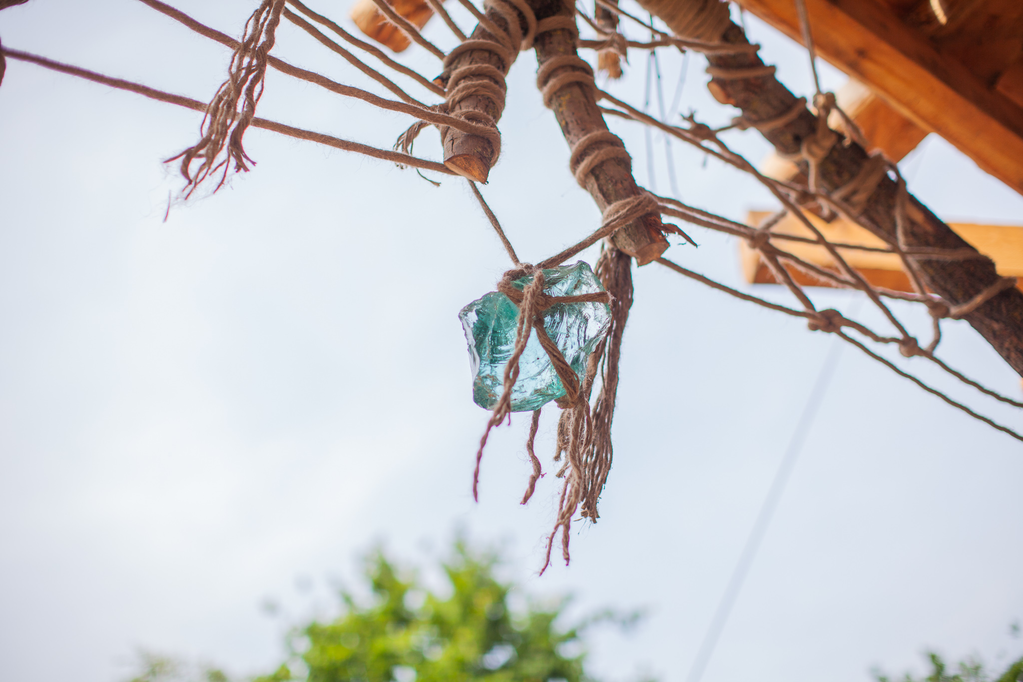 树枝上用绳子捆绑了水晶