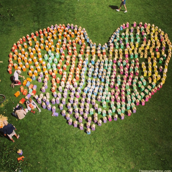 这个丹麦小哥Dambo还有一个《Happy City Birds》(城市里的快乐鸟)项目,从2006年开始进行,用了7年时间在世界各地制作了超过3500个鸟窝,现在也在进行,这些鸟窝都是用回收材料和废弃木料制作而成,包括所用的油漆也是丹麦油漆公司所捐赠,他给了因为城市里无家可归的小鸟们一个家,让它们在城市里快乐的生活。