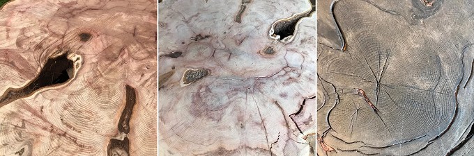 对树木进行拓印其实步骤非常反复, Shona Branigan 需要先用燃烧的火炬烧掉较软的木材边缘,并使横截面的凹凸更为明显。