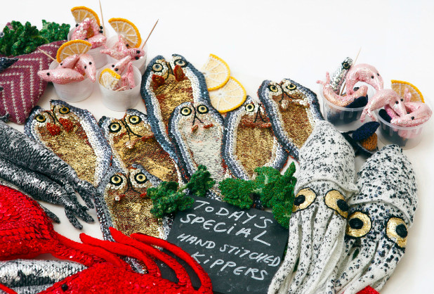 在2015年,詹金斯(Jenkins)进行了迄今为止最大规模的装置,钩编了数十种沙丁鱼,贻贝,蛤,虾,虾,龙虾,龙虾,螃蟹和其他来自海上的美食,这就是在亚历山大大帝宫(Alexander Palace)的全尺寸鱼计数器“ Kate's the Stitchmongers”。
