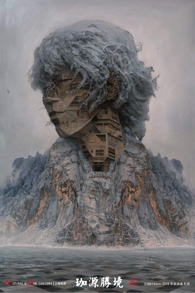 杜昆曾在2016年因一套名为「众神闹」的作品走红网络,他将这些作品命名为望川楼、观云阁、珈源胜境、莫后禅院、朋客寺等等。这些虚构的景点远观一眼望去便不难辨认出莫文蔚、谢天笑、左小祖咒等音乐人,但是这些作品妙处在于,只有近看才能发现组成这些熟悉的肖像的都是山石树木之间的亭台楼阁、道观古刹。