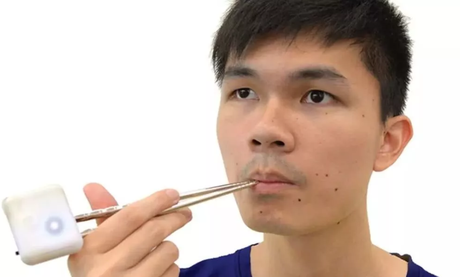 当我们用筷子吃饭时,筷子夹到食物,再接触舌尖,这时通电装置发出的微电流就会刺激我们的味蕾,改变食物的味道,即便是没有盐,没有味道的食物,我们也同样可以尝出咸味。