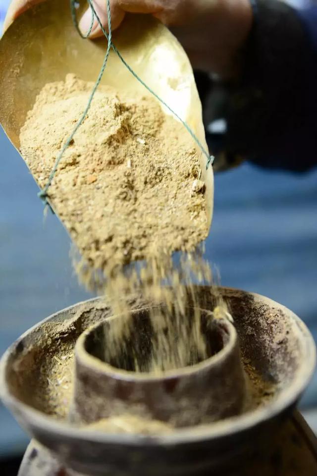 在磨成粉的中草药中加入上次制作保留的酵母,让磨成粉的中草药有了醇化与发酵的过程,使草药的味道被中和,香气也更为丰富独特。