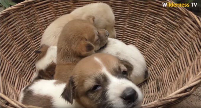 择日不如撞日,说干就干!小哥把它们塞进竹筐里带回了家,此时狗子们似乎也知道自己安全了,互相靠着对方,迷迷糊糊地开始犯困。