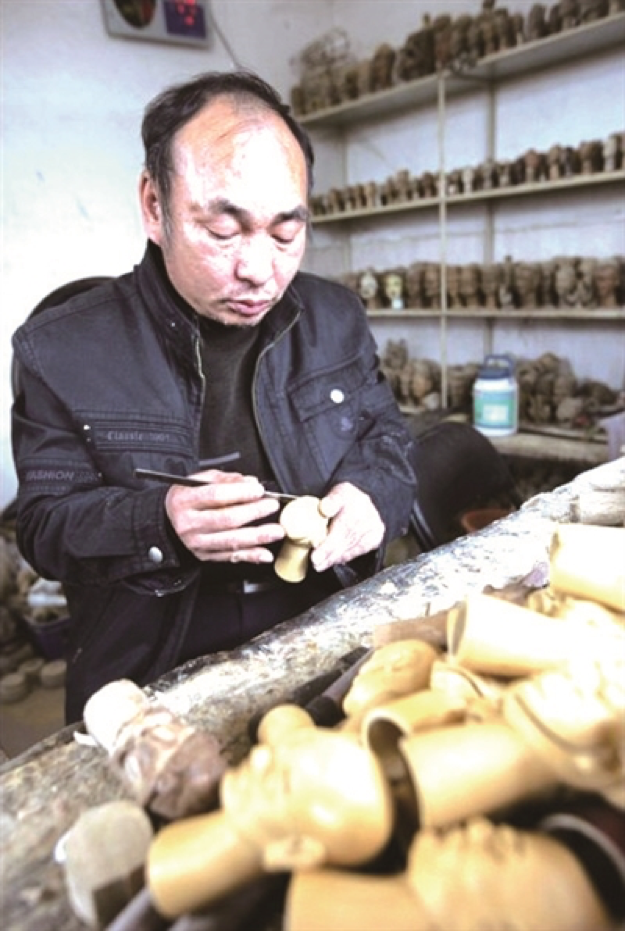 傅明筑已与木偶雕刻相伴了三十几个春秋。