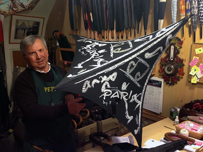 除了修复雨伞,Thierry Millet也会自己制作伞,其中最为特别的是一把埃菲尔铁塔形状的伞。