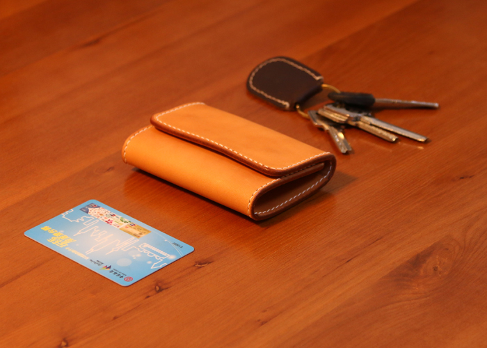 内衬做了一个标准的卡位,能够放1-2张的日常用卡,钥匙扣是镀铜五金,和植鞣革也搭,防氧化能力很不错。