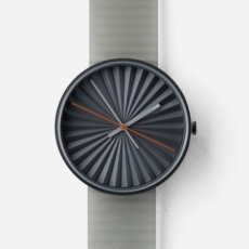 作品的特征是表盘富有立体感褶皱状的浮雕图案 。与表盘的褶皱相呼应的是表带,设计师巧妙的应用聚氨酯材料搭配上褶皱的条纹,整个设计也更加协调。表带没有采用常