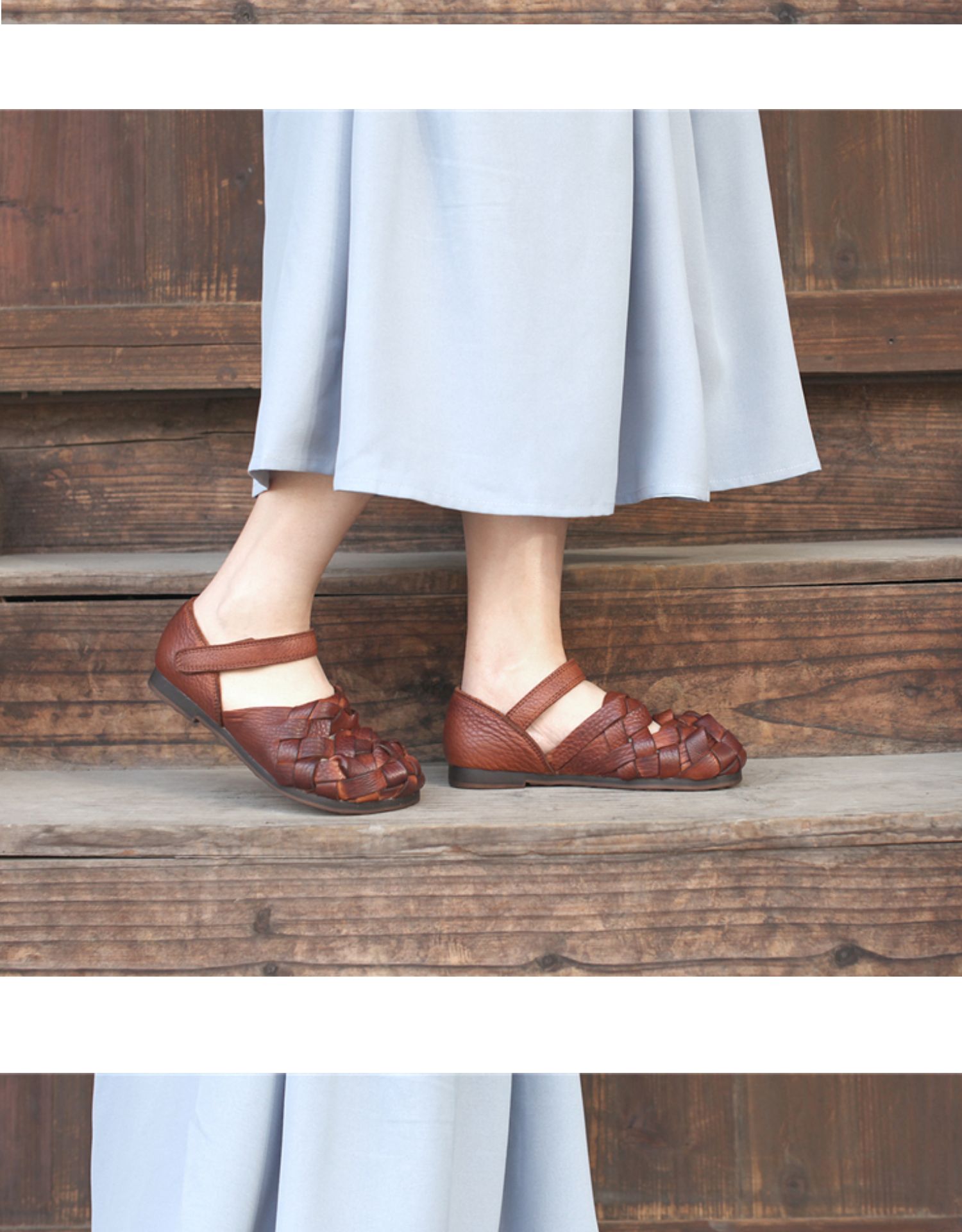 夏新款复古系做旧圆头真皮编织舒适软底百搭女单鞋凉鞋