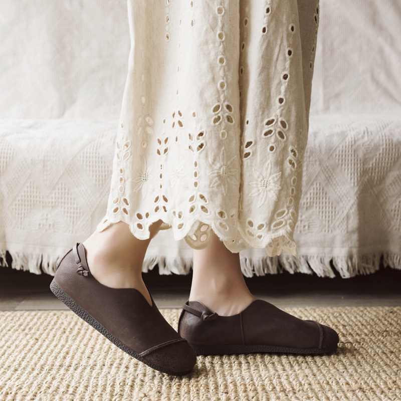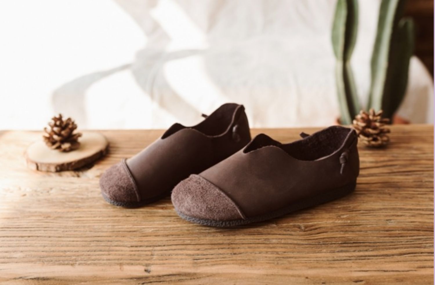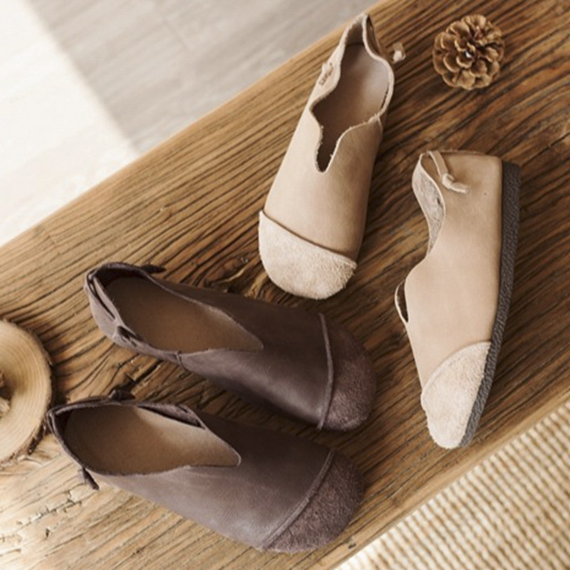 森系文艺复古拼接真皮圆头两穿法豆豆鞋纯手工女单鞋