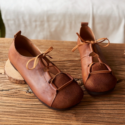 春夏森系复古真皮拼接圆头系带软底舒适百搭纯手工女单鞋