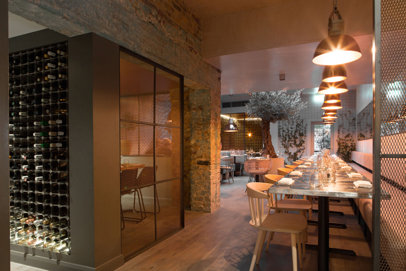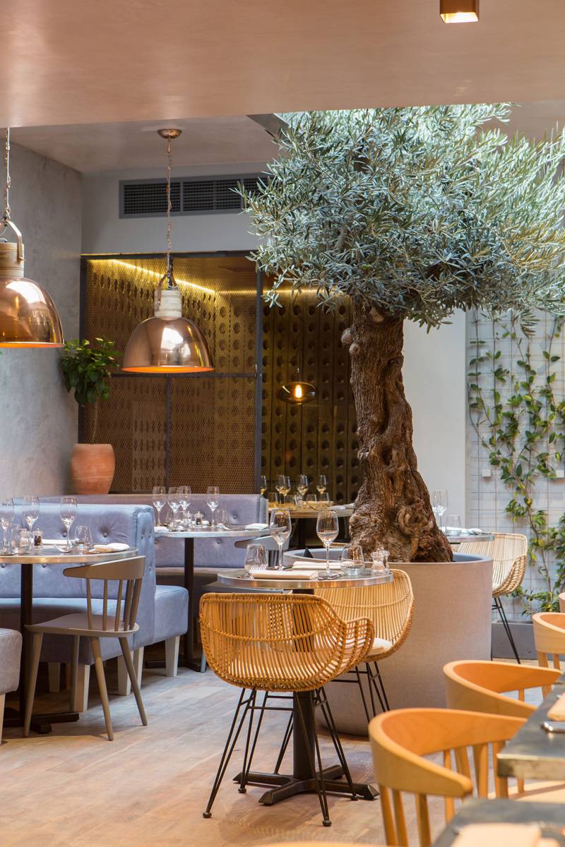 在这个餐厅内,天光和橄榄树的色调同空间灯源及红铜材质的色调的融合,使空间变得平和温暖。