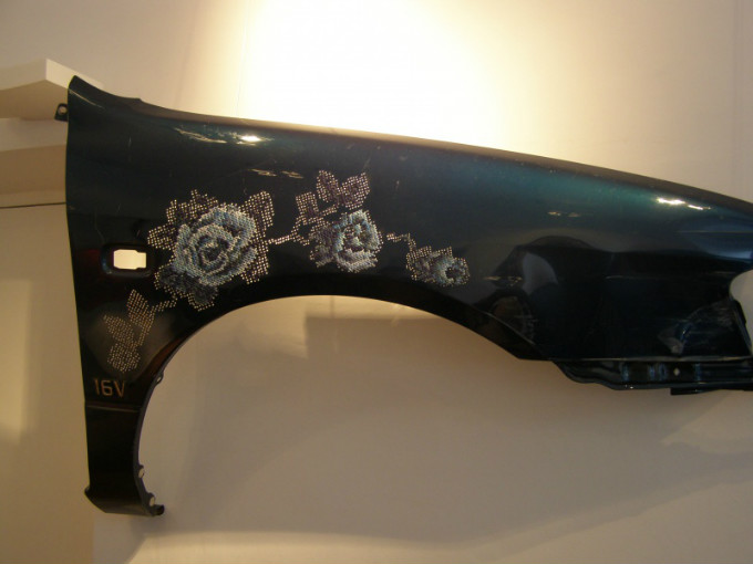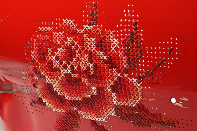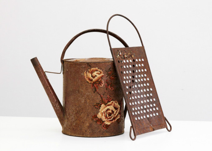 立陶宛艺术家Severija Inčirauskaitė-Kriaunevičienė的十字绣可谓离经叛道,所有艺术评论家均将她定义为为“先锋艺术家”。她奇思妙想地在日常生活常见的金属器具上穿针引线,丝线走过,留下繁花盛开。她的一针一线早已脱离既定的模式,摒弃了所有人预想中的刺绣媒介,颠覆了这门有着几千年历史的传统刺绣手艺。