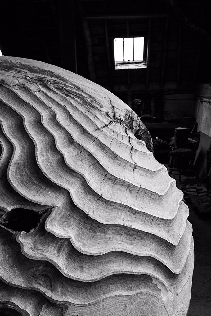 球体木头被凿出如山脊如梯田般退晕的肌理感。凝视它们的时间稍久点,内心会莫名的安静下来,好像眼前展开了水波荡漾的画面,泛起涟漪的通感。