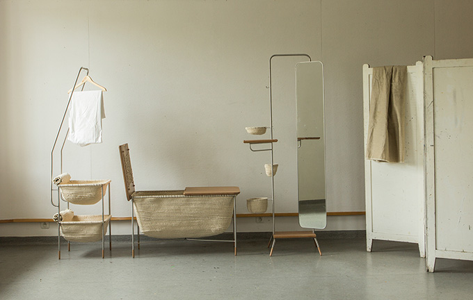 她运用别样的编织手艺,结合不同的材质相糅合与创造,呈现出这组编织储物系列家具。
