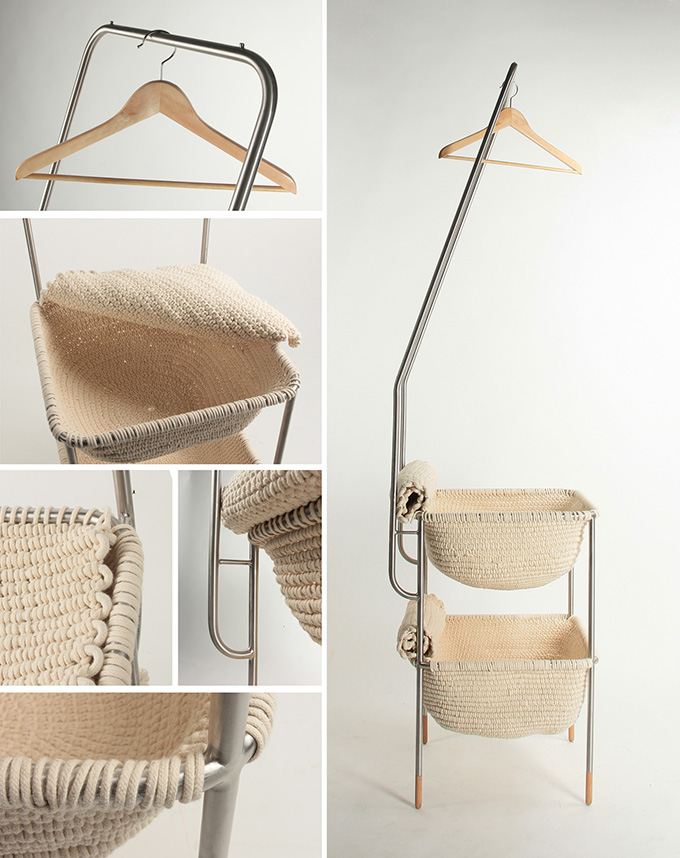 她潜心钻研,希望建立人与家具之间的强有力的联系,因而创造了一种独特的储物方式:自我。她的创作灵感来自于全球各地的传统篮筐,她运用别样的编织手艺,结合不同的材质相糅合与创造,呈现出这组编织储物系列家具。同时,她也重新思考了家具的不同形状、大小与比例,在空间内呈现出不一样的家具搭配和运用。系列所有家具,均采用环保材料,棉绳和樱桃木等自然材料的运用,很大程度上柔化了不锈钢制材料的坚硬感官感受。