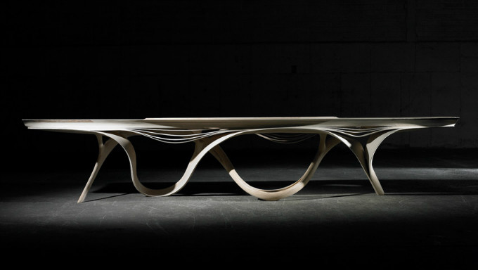Joseph Walsh一直在研究树脂,测试它的拉伸强度,尝试用它的拉伸纹理来代替玻璃台面,创造出有趣的家居产品。他们不断尝试突破已有的界限,在选材和想法上无比大胆,他和他的团队发展出复杂的工程技术,使树脂和大理石融合在一起,两相交融,形成既戏剧又美丽的餐桌。