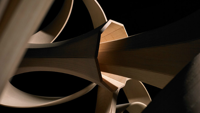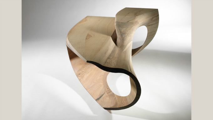 他的作品也是形态多变的,线条变幻性强,硬朗的木材在他的创造性设计下柔韧得像绸缎。来自材质本身的自由形态组合,通过模具形成特定的形状,突破了使用木材的传统方法,造就了具有功能性的舞动家具。他凭借对木头结构、形式、材料、技术和生态的深度研究及探索,将设计美学和结构功能学结合到完美无缺。