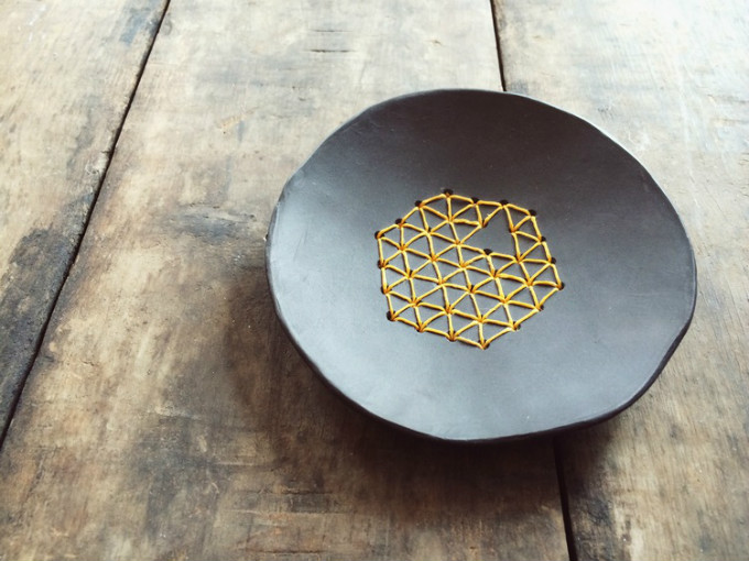 刺绣装饰陶瓷盘子,几何图形一圈一圈的绕成网状,如捕梦网般,是不是也可以捕获生活中的小美好。