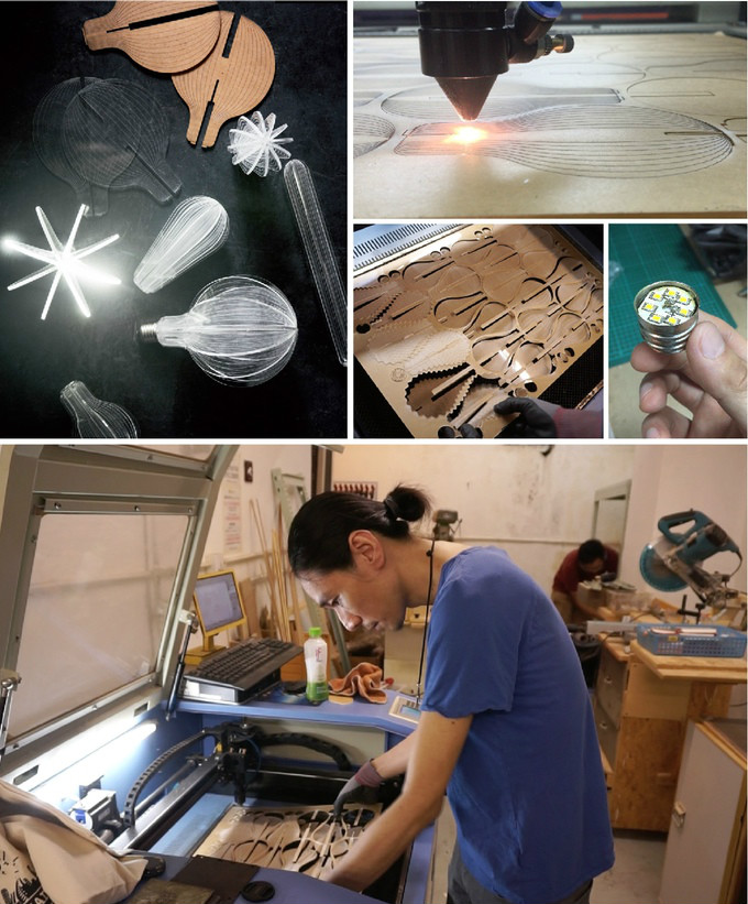 研究每个灯泡的形状和形式风格、材料试验、开发3D模型、试验基座、激光切割,Nap团队一共花了8个月。每一个灯泡都包含6个树脂玻璃。但是要把6个碎片组装到一个单位中就跟在玩一个3D拼图一样困难。所以拼装过程中得精确计算尺寸,并且非常小心。在研发过程中,这个团队开发出了很多不同厚度的树脂玻璃原型。生产开始于一系列的草图起草,在草图完成之后,激光切割机器就会切割出相对应的树脂玻璃片,所以每个玻璃的边缘都非常圆滑。之后就会有人来手工拼装成成品URI了。