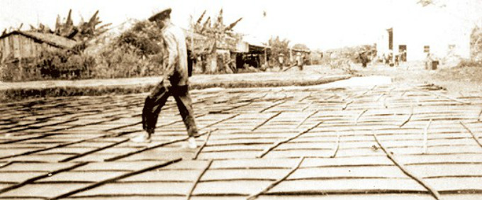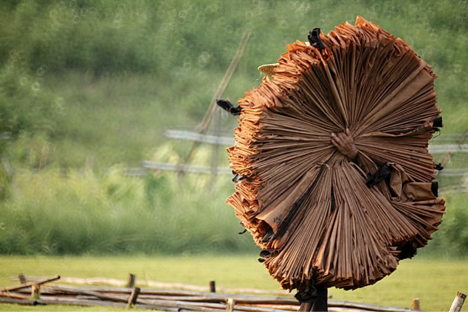 晒干的过程中,为保证香云纱平贴草地,工人会用一些竹竿压着布面,为防止被压着的地方晒不干,过一段时间,就要用脚把竹竿挪挪位置,工人们把这叫做“踢竹”。