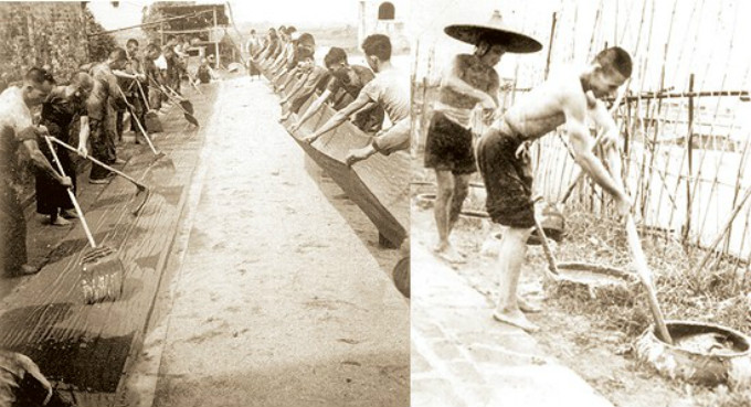 经过浸染后,布的红棕色变得足够深了,晒莨工作也进入了决定性的阶段。工人从河里淘来河泥,在早上四点半左右摸黑起床,把布一匹一匹排开在专用的涂泥缸旁边,将河泥单面涂抹在布上。随着黎明阳光的到来,河泥会在慢慢变干的过程中和布上的薯莨充分反应,在这一刻,香云纱会经历最奇妙的成长阶段。它涂泥的表面,将由红棕变成油亮的黑色。