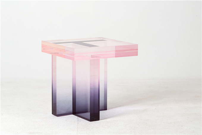 每块丙烯酸树脂板具有两到三种颜色,桌子经过阳光的照射,会形成折射和反射,营造不一样的视觉美感。小方桌渐变的色彩改变了水晶器具色调单一的缺陷,使得这些作品既极具未来感,又充满着梦幻色彩。