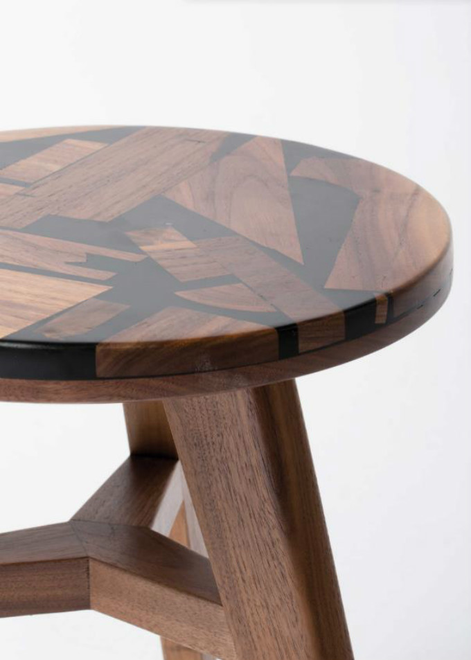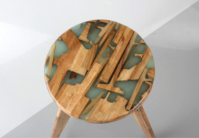 木凳的整体均使用的白橡木材料,凳面则是由切割凳子腿后剩余的边料与透着翡绿色的树脂材料共同加工而成。树脂的形态可控完美地填充了碎木料拼接而留下的空隙,同时也中和了木料的硬质特性,设计师用他们的巧思为我们呈现出了这一符合当代生态设计思潮的作品。