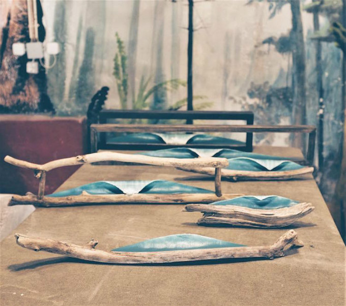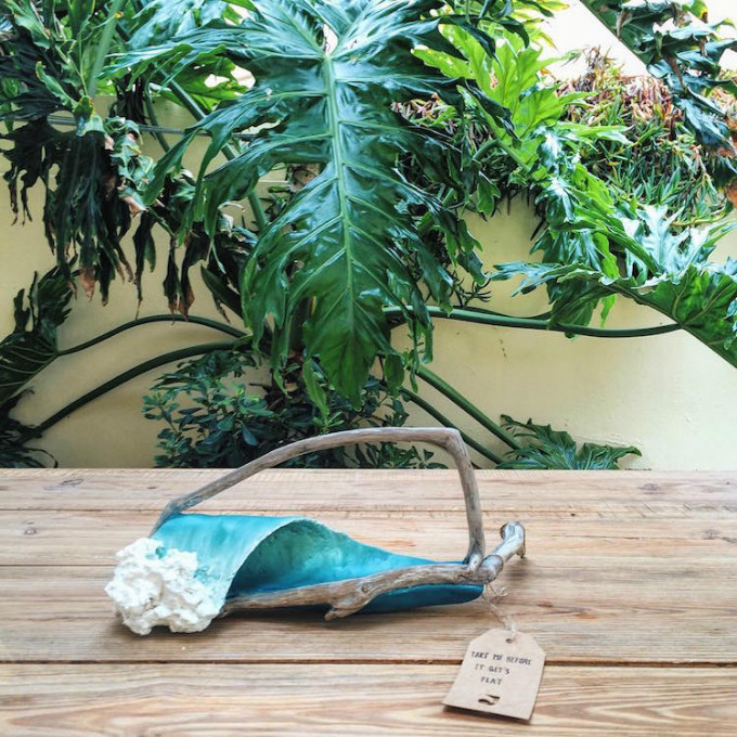 他在海滩上找到那些废弃的木料,经过海水的浸泡和腐蚀,木头形成独特的线条纹理,天然就是一件有味道的摆设。Johny以这些木头为基底,用石膏做出海浪的形状,填上颜色,海洋气息扑面而来。