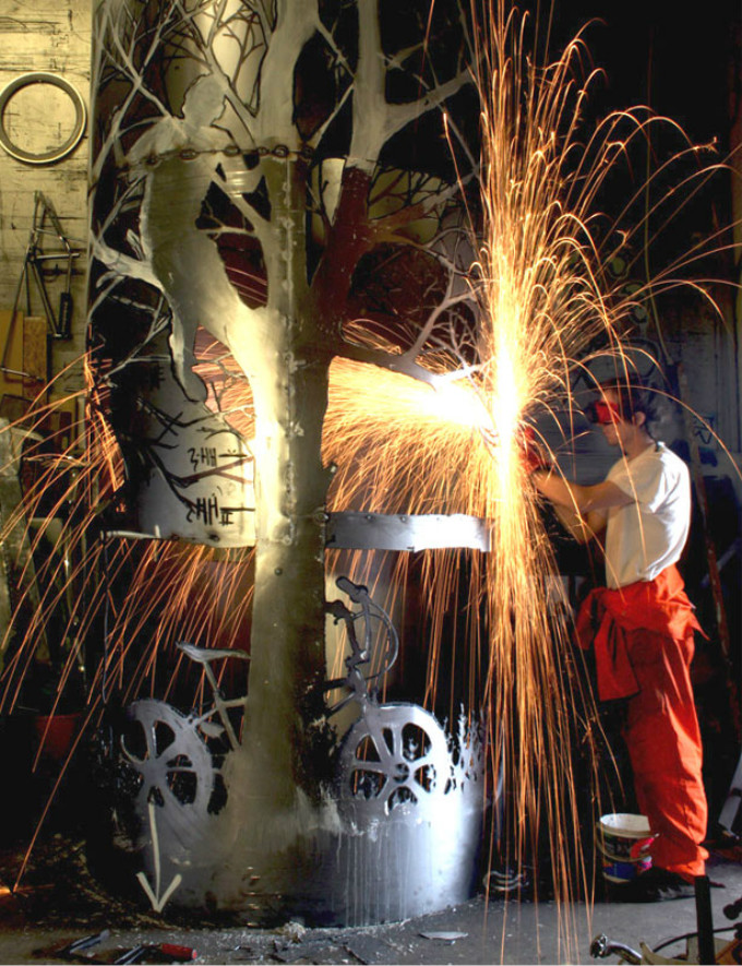 他最引人注目的作品之一,叫做“Nature Delivers”,是在一辆白色的运输车上进行的雕刻创作。他用切割的方式让“森林”呈现在车身上。强烈的视觉效果表达出人类文明与自然力量的融合。
