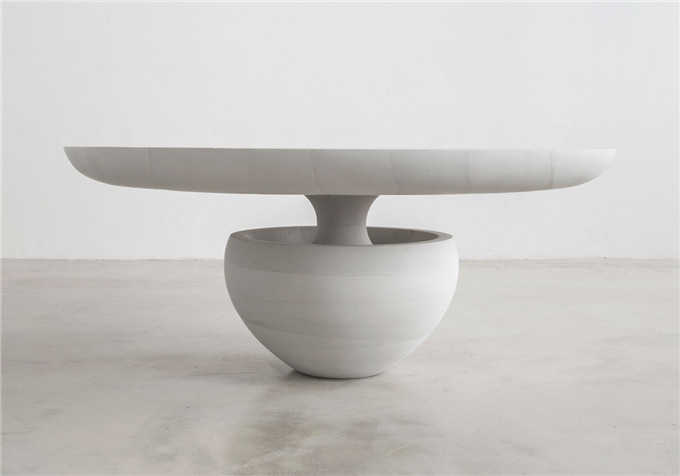 水泥雕刻成餐桌像是在抗拒重力般,桌子的顶部在一个圆底上保持平衡,使用餐的视角变得新颖。