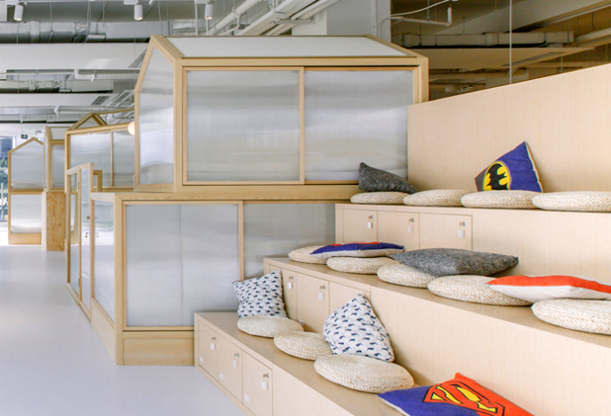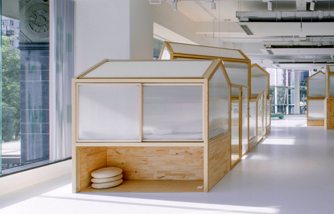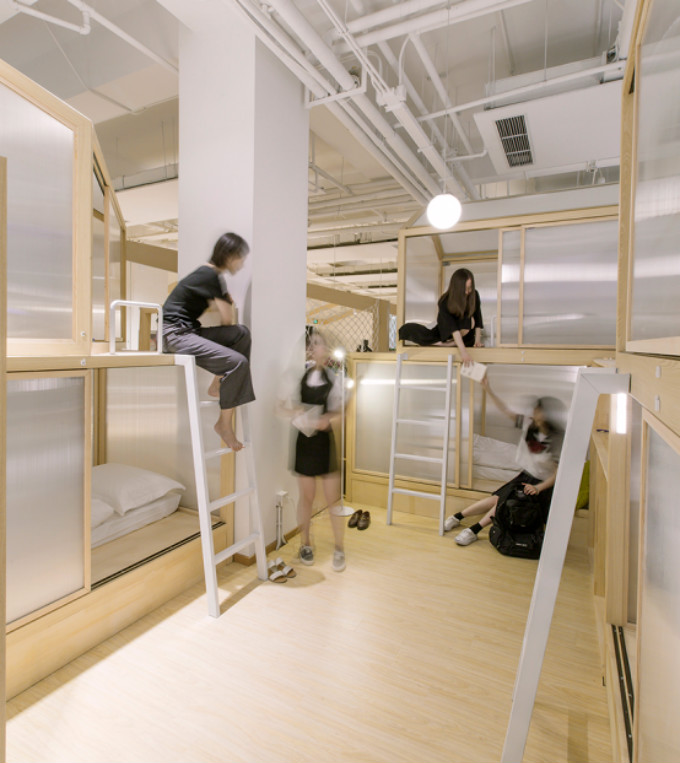 曹璞为“一起一起”国际青年旅舍打造了全新室内设计,将胶囊酒店打造成一家家露营小屋。此设计灵感源自露营或是音乐会时大家带出外的帐篷,主要以木材及半透明玻璃打造,能够保持一定的私隐同时,又能在关门后为房间带来光源。旅舍内的大型共享空间,除了让旅舍作活动用途,也能让不同地方入住的客人可以互相交流。旅舍有单人床及双人床选择,而每张单人床的上、下层均以不规则的设计,为住户增添趣味。