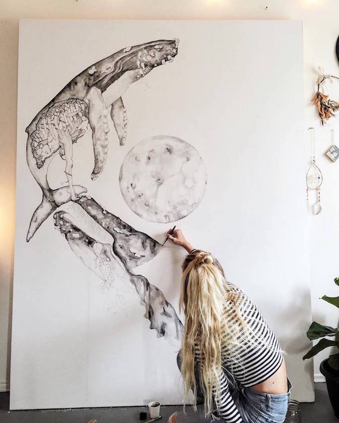 一年以前,Quinn曾独自一人从墨西哥边界到加拿大边界。在旅途中,Quinn见到了濒危物种莫罗湾袋鼠。爱极了海洋的她创作了以袋鼠和鲸鱼为主题的画作,在她眼中哪怕是一个很小的陆地生物也和海洋有着千丝万缕的联系。