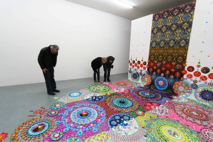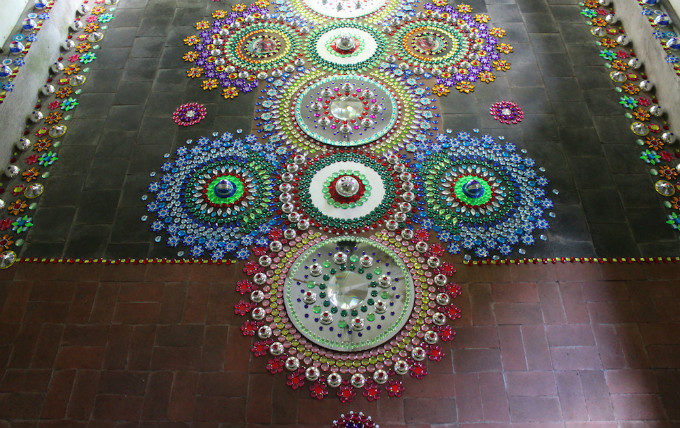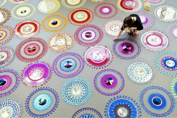 Suzan Drummen的地毯大多数使用水晶、镀铬金属、宝石、镜子和光学玻璃等材料,看起来很像我们小时候玩的“万花筒”,以类似分形的排列和华丽而精致的圆圈为特色,彼此间呈指数增长,一圈又一圈的彩色圆圈平铺在地板表面,这是一种非常刺激的感官体验。闪闪发光的组合与空间融为一体,爬上墙壁,像是在墙上开出一朵朵明艳透亮的水晶花朵。