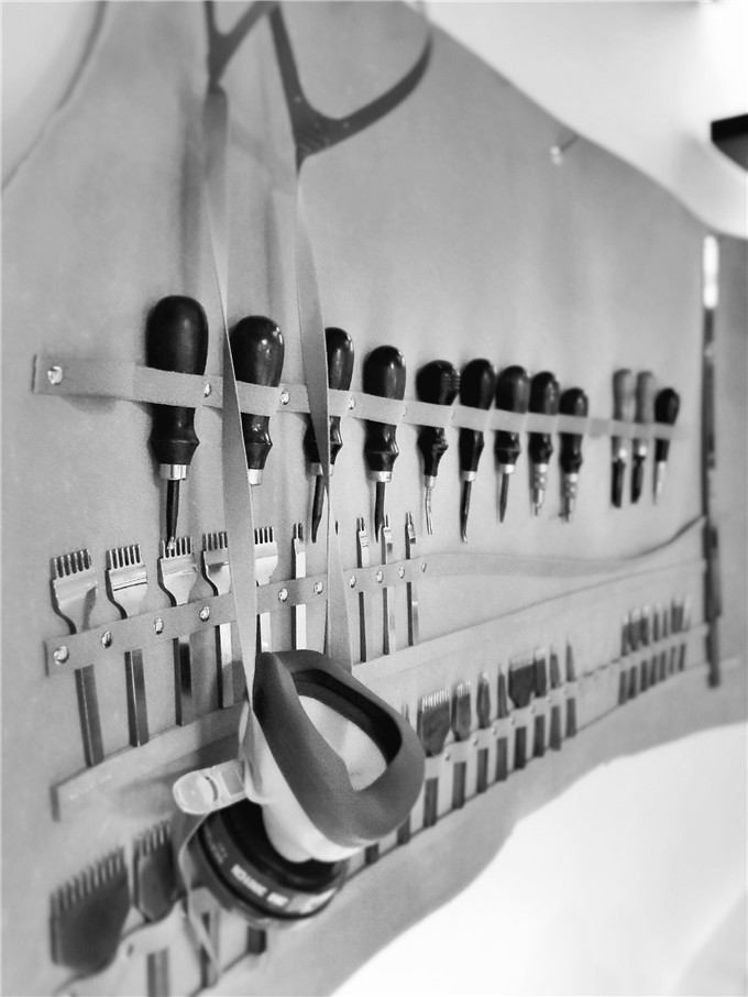 当一张皮料经过刻刀线、敲纹路、上色几个缺一不可的步骤,