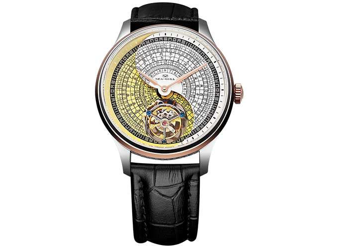 海鸥18K金太极倾角陀飞轮男表218.98.8808G,人工合成蓝宝石表镜,表盘直径43mm,表身厚度13.5mm,防水50米,谢卵巢结合了中国的太极八卦元素,非常符合时下中国风的潮流。