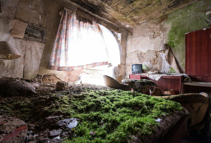 他小心翼翼的把这些植物穿插到水泥结构中,