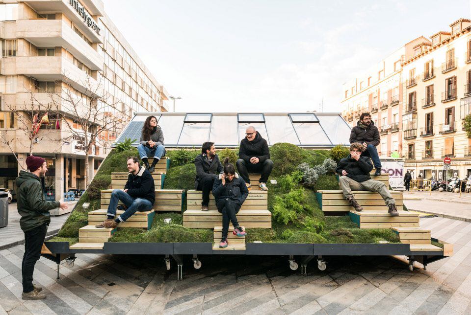 以此为着手点,MINI 和 Enorme Studio 共同完成了一项装置设计,并展示于马德里Plaza Santa María Soledad Torres Acosta广场中。MINI 和 Enorme Studio设计了一座很有意思的建筑。这个名为Mountain on the Moon的实验项目包括三个移动结构:玻璃房/办公室和梯形长凳座椅,两侧都有迷人的绿色植物。