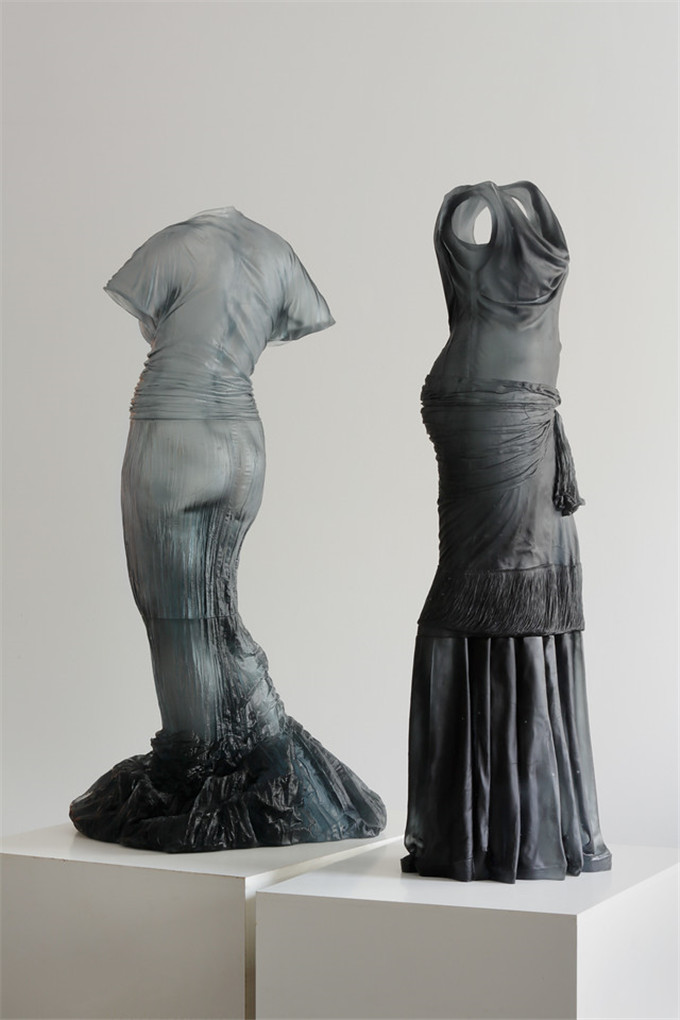 虽然每一件作品都是没有人体的衣服,却让人感觉有一个透明的女性在穿着它,隐约可见的丰腴姿态,尽现女性躯体的柔美。