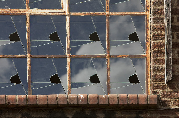 破损的玻璃窗总让人联想到衰败和经济萧条,