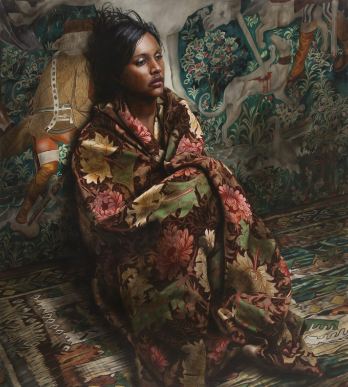 在他的作品中,人被织物全方位的包裹起来,并在上面描绘了和背景相同的,环绕女性主体的图案和图式。在Markus看来,这些旧式织物并非简单的是作为财富和传统的象征,而是用他们来制造阴森的环境。你仿佛可以透过重重的障碍,看到被包裹下的人脸上浮现的悲伤表情,纺织物遮住了他们的面庞和身份,却让情感更加浓烈。