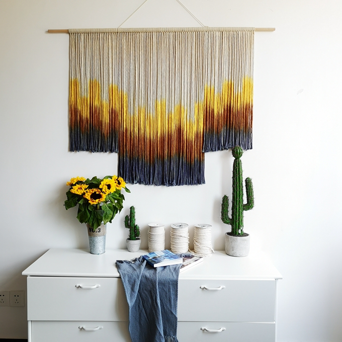 执着的经过各种选画均已不满意告终之后,一个偶然的机会让她接触到一个macrame挂毯课程,Macrame编织,一般用全棉棉线经手工编织,由上世纪七十年代嬉皮士所创,后风靡全球,尤其在北欧,随性自然的挂毯更是取代传统挂画,成为家居装饰的日常。当她看到这种热情洋溢而又温暖的挂毯的第一眼,就兴奋到跳“没错!就是它了!”当下决定自己做!行动力超强的她一头扎进挂毯编织中。