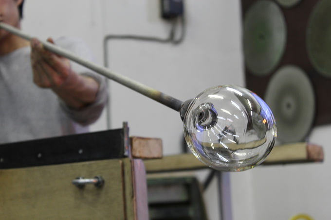 其中热加工需要将原料投入1500 度以上的窑炉内进行熔化,摒去气泡杂质之后,在柔软状态下的硝子就可经由吹杆吹制,在匠人们的手中一边旋转一边在空气中慢慢冷却成型。