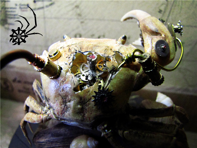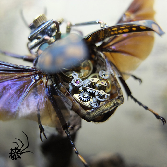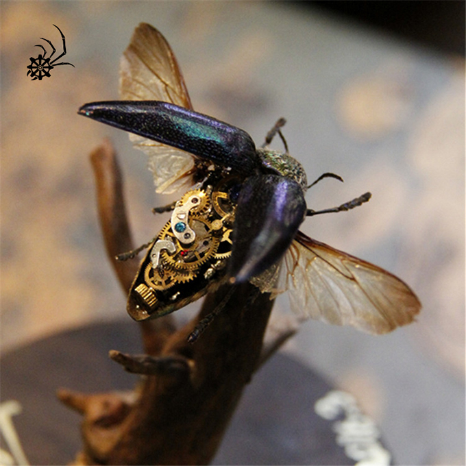后来,他在逛百度贴吧的时候,无意中接触到蒸汽朋克艺术并被深深吸引,朋克精神加上机械美学,正是当下年轻人的心头爱,他想若是能将这门风格独特的艺术运用到昆虫标本上,就能给死去的昆虫赋予新的活力,让它们重获新生,也就是所谓的“死亡后的新生”!