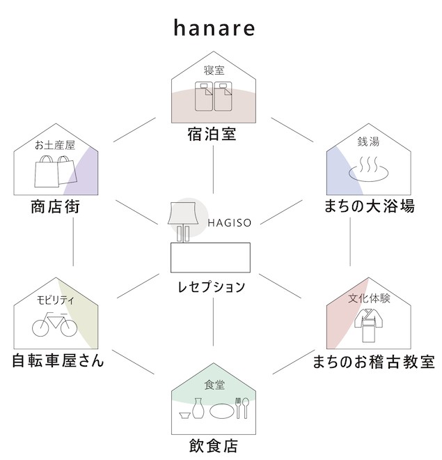 Hanare Hotel 本身分为两栋相隔一分钟距离的独立建筑,名为「Hagiso」的那一栋涵盖咖啡厅、选物店、展览空间以及 check-in 柜台,另一栋则专供住宿。老板希望将住宿地点不单限于建筑物本身,而是拓展至整个邻近街坊,让旅店的概念在整座小镇里延伸。
