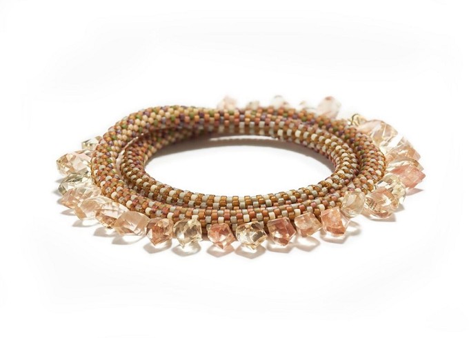 △「手镯:双层日长石」,Claire Kahn,2018年,柔和色彩的圆柱形玻璃珠、带刻面的日长石