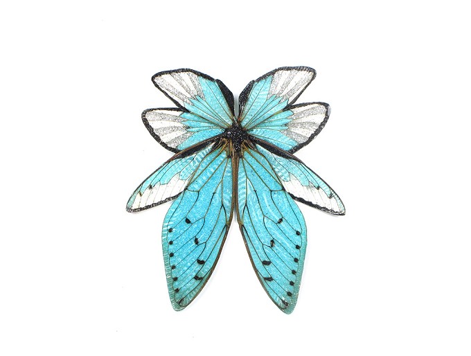 △「胸针:翅膀」,Märta Mattsson,2018年,蝉翼、树脂、清漆、颜料、银、碎石,12 x 8 x 0.5 cm